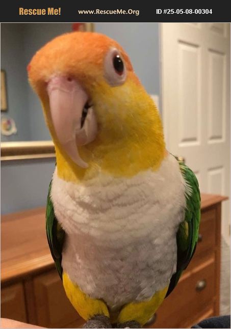 Kiki is a young male Caique. He is playful, but a little shy. He loves children. Currently no one is home to play with Kiki and he needs a loving home with plenty of attention. He ia about 12 years old. His birthday is April 1. He was raised with a Conure that passed away, so he should be good with other birds. He loves to sit outside on top of his cage during the warm weather. His toenails and beak need to be trimmed. He waddles around and flutters his wings, but does not soar or fly. He loves apples and mangoes.