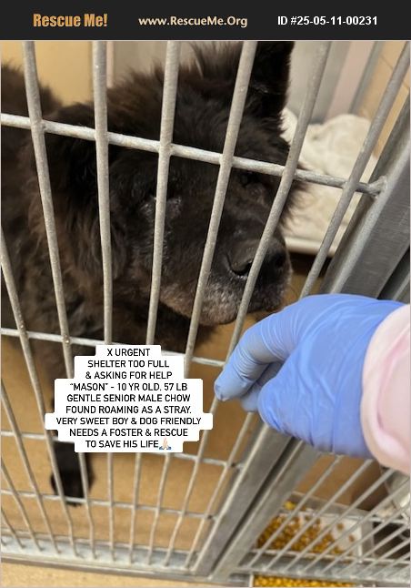Courtesy Posting: MARTINEZ, CA (N CAL)- ID #A1032116 CONTRA COSTA SHELTER- expected to be RESCUE ONLY - NEEDS LOVING FOSTER and RECUE OR GOOD HOME- 'MASON'- 10 yr OLD, 57 LB GENTLE SENIOR MALE CHOW FOUND ROAMING AS A STRAY. X URGENT -SHELTER ASKING FOR HELP AS THEY ARE A FULL KILL SHELTER- HE IS A VERY SWEET BOY, DOG FRIENDLY- NEEDS A FOSTER AND RESCUE TO SAVE HIS LIFE. We are in urgent need of finding a kind home and or foster and rescue for this poor older chow gentleman who was dumped and abandoned in somewhat geriatric condition. He was chipped with no name and the shelter said 'it appears his owner is abandoning him as they have not contact us or returned our calls/emails.' We are therefore calling dear boy 'Mason'. Despite his utter neglect and abandonment, Mason can be seen in video with some pep in his step when sees and greets other dogs. He is also feeling better since the shelter prescribed him gabapentin after noticing some difficulty originally getting up. He's now walking well. https://youtu.be/-2CIsVSetzA?si=kdDP0aiX0CDaUqS3 Mason can also be seen loving being pet at the end of this video after greeting many dogs happily: https://youtu.be/H03ULLfNbN8?si=cslPNBR2X6P_4TaR The shelter describes Mason as a 'sweet older chow' and said 'He greeted the other dogs in his ward happily.' They are hoping a rescue can ideally help, but most rescues need a foster and place for an older dog to go. He does have some age related issues and also noted entropion which a rescue may be able to assist with. The shelter has not decided if he will be adoptable yet, or remain Rescue only. While the shelter has told us they want to get a head start networking him to hopefully exit him asap, at a very full shelter, time is not on Mason's side. As he's off his stray hold and is currently Rescue only, so he can be added to the euth list very soon, unfortunately, Therefore, if you are interested in fostering, fostering to adopt, or helping Mason in some other way (ie., visiting him, pledging for his medical or rescue, transport, etc), please contact: [email protected] or Southern California Chow Chow Rescue Network asap who is trying to find placement, and can try to pair fosters or interested parties with a willing rescue group. Rescue groups may contact the shelter directly by calling (925) 608-8400 and providing ID, as well as emailing the rescue coordinator Shelly at [email protected] If you want to adopt, please contact us or Shelly to see if we can get approval from the shelter. We will post additional pictures, videos and updates on facebook at: https://www.facebook.com/783968124/posts/10167070754728125/?mibextid=wwXIfr Note: to view contents of links you will need to copy and paste each one into your browser separately.