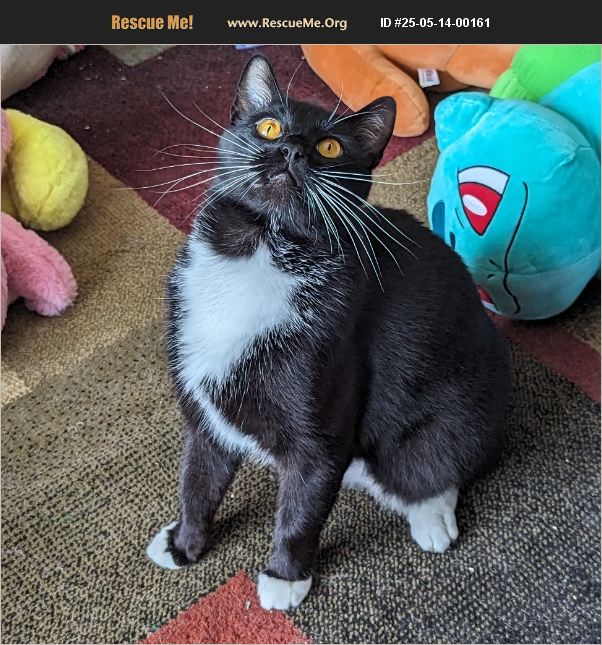 Badger is a 4 year old tuxedo cat with gorgeous orange eyes and long white whiskers. He's a people loving attention seeker that loves belly rubs and a nice plate of his wet food. Unfortunately, Badger was in an accident before he was adopted that led to his tail being amputated. This led to complications with his rear end where there is some atrophying of muscle. He can still run and play but his vet isn't sure if there will be complications in the future that require more special care. Aside from being a special boy, his only other quirk is that he requires a urinary diet (quite a few male cats do). He'd be better as a single cat in the household because he loves people more than he does animals, but he gets along with older, quieter animals that respect his space. I hate to have to re-home him, but I can unfortunately no longer afford his care and want what's best for him which is a low stress household that can provide him ample love.