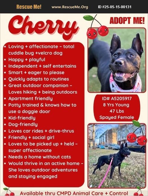 Meet Cherry: 8 Years of Waiting for a Forever Love Cherry has spent her entire life outside, never knowing the warmth of a couch or the comfort of being truly home. For 8 long years, she waited. And now, at 8 years young, she's finally getting her second chance - and she's ready to give her whole heart. Cherry is a pit mix (DNA test pending) with a heart as big as her name is sweet. She's heartworm positive, but don't let that scare you - she's getting treatment, and all she needs now is a soft place to land and someone to love her through it. Despite the life she's led, Cherry is full of joy. She adores playtime in the backyard, romps at doggie daycare, and belly rubs on the couch. She's great with other dogs, does well in boarding, and is crate-trained and potty-trained. She's the kind of dog who drools when she sees a treat and leans in for cuddles like she's making up for lost time. One of her most endearing habits? She loves when you hold her paw - and she'll gently place it in your hand, just to be close to you. It's her way of saying, 'I'm here, and I trust you.' Cherry does have a prey drive - no cats, please - but she does wonderfully with kids and just wants to be someone's everything. She's ready to be the queen of your heart and home. She's waited her whole life for love. Could you be the one to show Cherry what forever feels like? Please share or reach out if you think Cherry might be the missing piece in your life.