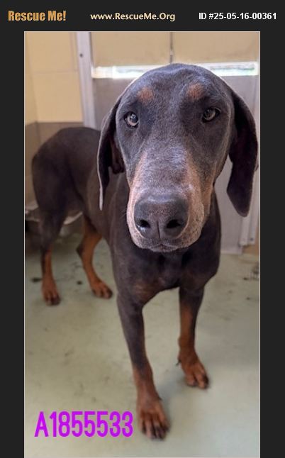 Located At: Riverside County Animal Control - Riverside Shelter Description: I am a female, 71.00 lbs, gray and tan Doberman Pinscher. Age: The shelter staff think I am about 3 years old. More Info: I have been at the shelter since Apr 30, 2025.