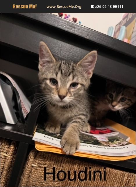 This adorable kitty is Houdini. He is a 10-week-old shorthaired brown tabby. He is at a foster home, not at our shelter. The foster says 'Houdini is a playful little guy with a big appetite-for both food and life! Whether he's chasing toys, exploring new spaces, or gently nibbling your fingers with affection, Houdini brings a spark of joy wherever he goes. Houdini is curious, active, and always ready for his next snack or adventure.' Houdini is vaccinated for age, microchipped, neutered and healthy. His adoption fee is $225. If you would like to meet/adopt Houdini, please complete our online application at https://daws.org/daws-forms. Email [email protected] with questions or for more assistance. Houdini can't wait to meet you!