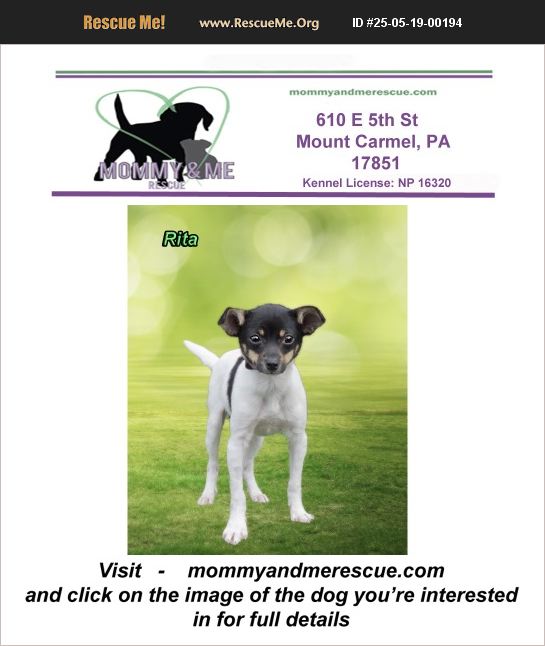 Please fill out an application here ) https://mommyandmerescue.com/adoption-application/ and give your vet clinic permission to speak with us. Spayed/Neutered, UTD on vaccines, Chipped Adoption fee 400 You must submit the application and be approved prior to meeting one of our dogs. If you have questions please EMAIL [email protected] or visit mommyandmerescue.com Kennel License: NP 16320 Rita Rat Terrier Mix Female Age:2/6/25 Weight: 4 pounds Rita was a breeder surrender. She is a very little girl so she would do best with older kids who know how fragile she is. She is loving and sweet. Other dogs and cats ok. Not house-trained.