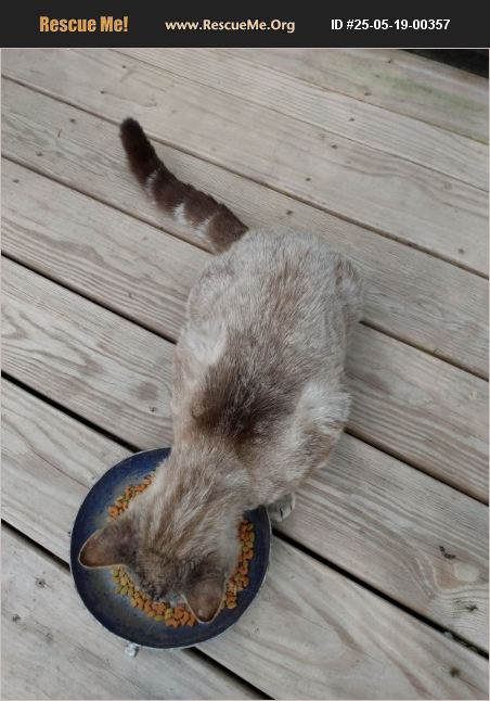 This cat appeared at my friends house this April. He has a flea collar but has since lost it. We have tried to find an owner but have had no responses. He is friendly and tries to come in the house. He has blue eyes, that is why I am assuming he is Siamese. He has an injury from when he was recently attacked by another cat or dog.