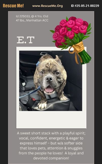 E.T is a dog who thrives with people he trusts. At first, he can be vocal and energetic, eager to express himself, but once he settles, he reveals a softer side. He readily approaches those who take the time to interact with him, checking in with handlers and responding positively to gentle touch. He leans into petting and enjoys attention, showing signs of affection when he feels comfortable. Despite his initial excitement, his body language remains loose, and he walks with ease on a leash once he's outside, enjoying exploration and moments of calm. E.T has a playful spirit and enjoys engaging with toys, gripping them firmly and demonstrating his enthusiasm. When he gets the chance to stretch his legs, he moves confidently, following his handler on jogs and walking with a relaxed frame. He is intelligent and food-motivated, making him highly trainable with patience and structure. When redirected with treats, he eagerly responds, focusing on his handler and demonstrating his ability to learn and adjust to expectations. His willingness to engage and build connections makes him a wonderful candidate for a patient and loving home. With a stable environment and a routine that fosters his confidence, E.T will be the most loyal, affectionate companion. He has a lot of love to give, and when he feels secure, he seeks out attention, leaning in for pets and displaying signs of trust. He would thrive in a home that understands his energy and offers him the guidance he needs to navigate the world comfortably. He has charm, enthusiasm, and a strong desire to connect-qualities that make him a truly special dog for someone willing to take the time to help him shine. WHAT MY FRIENDS AT ACC SAY ABOUT ME: My history is a mystery and my friends here do not know much about me yet. I'm ready to learn! I need a patient person who has the time to work on training with me. I don't always like to share my food, toys and bedding with other animals. I would do best in a home with only adult humans (Age 13 and over). I love getting pets and --- you guessed it - snuggles! E.T, ID# 225033, @ 4 Yrs. Old, 47 lbs., Male Manhattan ACC, Medium Mixed Breed, Brown Brindle/White Surrender Reason: 5/19/25 - Stray Behavior Assessment Rating: LEVEL 4 Recommendations: No Children under Age 13 Medical Behavior Rating: 2, BLUE.