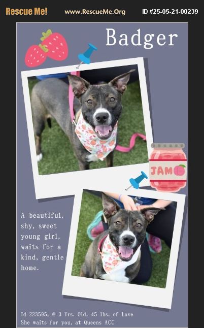 She's a beautiful, shy, sweet young girl who arrived at the shelter a stray. Trembling during her medical exam, it was apparent she was feeling traumatized by her experience and was feeling overwhelmed in the shelter. BADGER will come to the front of her kennel, then back away a few times before she is lured out with cheese, leashed and taken outside, where she sniffs intently with a tucked tail. Badger will not take treats outside, she just doesn't have that confidence yet. More cowardly lion than brave lady, this lovely, petite girl needs a kind, gentle home where she can decompress and warm at her own pace to her new life. If you are an experienced foster or adopter who can provide her the calm, structured environment where she will flourish and shine A VOLUNTEER WRITES: 'Badger was found tied in a park with bag of food, bowls, toys and even some clothes. She is a petite 3 years old, and under 50 pounds. Her ears may account for most of her weight given their size. Badger has been very fearful given her circumstances, and she has been trying her best to be as brave as possible to show off her stuff. Badger slowly warms up and accepts gentle pets. She has consistently become looser and even wiggly with more familiar handlers. In an interaction with a novel dog, Badger offered play bows, but then became overwhelmed and walked away. In the yard, Badger plays briefly but remains nervous. She is more social out on the street one on one, sliding into a hidey hole with Rachel. Badger is a girl we want to see thrive and shine, and she isn't able to show herself fully at the shelter.' THE VOLUNTEERS MADE ME A REEL! PLEASE CONSIDER FOSTERING OR ADOPTING ME! https://www.facebook.com/reel/1196092181983060 WHAT MY FRIENDS AT ACC SAY ABOUT ME: My history is a mystery and my friends here do not know much about me yet. I would appreciate slow introductions to new people and places to help me feel safe. I prefer to call the shots and enjoy coming to you when I'm ready for pets. I would do best in a home with only adult humans (Age 13 and over). BADGER, ID# 223595, @ 3 Yrs. Old, 45 lbs., Female Queens ACC, Medium Mixed Breed, Black Brown/White Surrender Reason: 3/31/25 - Stray Behavior Assessment Rating: Level 4 Recommendations: No Children under Age 13 Medical Behavior Rating: 2. BLUE.