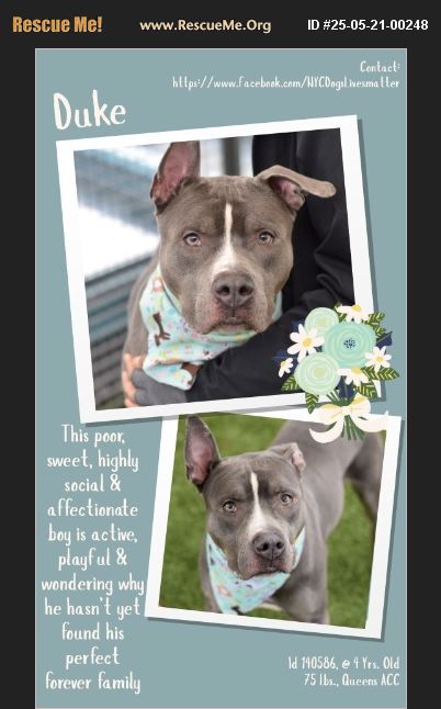 Three years older and still unable to find the family that was always meant to be his, poor NEWTON (now DUKE) is back at the shelter due to his family moving. His owner stated that their favorite thing about this sweet guy is 'He is very loving, huge but gentle, and his floppy ears. Duke loves watermelon and can make a toy out of anything.' This poor guy first arrived in April of 2022 after his owner passed away. He was adopted that same month and returned in September of that same year due to his family having no time for him. All this has happened to him through no fault of his own. DUKE deserves a forever family. Please help him find the family he was always meant to have. A VOLUNTEER WRITES: 'AT RISK!!! We notice Duke right away with his one antenna ear up, honing in on all the goings on of the shelter. He is a big boy, unmistakably cute with a great personality. We get him to play and zoom about the yard for a few minutes but he's much more interested in showing off his tricks and getting treats. Duke has been with us for 40 days and now is at risk for euthanasia. Duke has a history with our shelter system that dates back to 2022 when his original owner passed away. He's been adopted and returned a few times and most recently after three years in a home. In his home, he was described as social, affectionate and quiet. He allows grooming and loves car rides. He knows cues like sit, treat and paw. His guardian's favorite thing about him is that he is 'very loving, huge but gentle, and his floppy ears.' Duke loves watermelon and can make a toy out of anything. Though Duke has done well with familiar dogs in his former home, he's been conflicted in gate greets in the shelter. He does not do well with cats. Duke is available to an adult only home that can work on some basic manners and issues with hyperarousal. He is publicly adoptable and can be reserved via the EPL link in our bio or fill out the prescreener form to foster. Duke is approx 4 years old, 75 pounds and his ID is #140586.' my friends at ACC say about me: I would appreciate slow introductions to new people and places to help me feel safe. I'm ready to learn! I need a patient person who has the time to work on training with me. I love to be loved, but on my own terms! Let's brush up on some canine body language together! I would do best in a home with only adult humans. I need a home where there are no other dogs. I need a home without cats or small animals. I will need daily physical activity to keep me healthy and happy! DUKE (fka NEWTON), ID# 140586, 4 Yrs. Old, 75 lbs, Neutered Male Queens ACC, Large Mixed Breed, Gray / White Adoption Return, 4/10/25 Owner Surrender Reason: Moving Shelter Assessment Rating: LEVEL 4 Recommendations: No children under age 13 No cats. Single pet home Recommend no dog parks. Medical Behavior Rating: 2. BLUE!