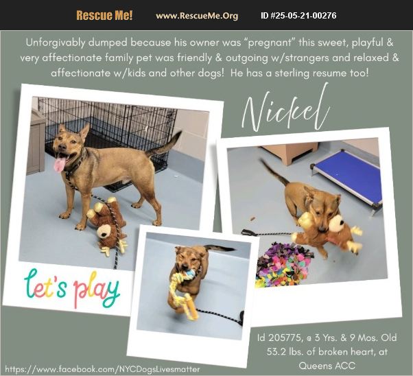 Nickel's story is one of resilience and hope. Abandoned by his owner when she became pregnant, Nickel found himself alone, confused, and heartbroken at the shelter. Despite this betrayal, he hasn't lost his ability to trust and love. He remains friendly and outgoing with strangers, gentle and affectionate with children, and enjoys being around other dogs-though shelter life has made him uneasy in close quarters with them. In a more comfortable environment, his sociable nature can shine, making him a great candidate for a home with kids or other pets. His high energy and playful spirit make him an ideal adventure buddy, and he's already accustomed to outdoor relief and leash walking, meaning he has a solid foundation to build upon in a loving home. This bright, self-assured pup finds joy in chasing frisbees, wrestling, and playing tug-of-war. He lights up when given squeaky toys and thrives when exploring the outdoors. Nickel's confidence and very affectionate nature prove that, even after heartbreak, he still has so much love to give. He is a devoted friend and loving companion, ready to bond with someone who will never turn their back on him again. While shelter life has been stressful for him, he's ready to step into a home where he can feel safe and secure. Nickel is currently feeling stressed and lonely at the shelter, but the right home will change everything for him. He may need reassurance in new situations, especially during baths and nail trims, but his ability to tolerate handling shows that trust and kindness will help him flourish. It's time for sweet Nickel to find a forever home where he'll be cherished, understood, and given the space to grow. Will you be the one to give Nickel the unconditional love he deserves? Come meet him today and see just how special he truly is. NICKEL, ID# 205775, @ 3 Yrs. & 9 Mos. Old, 53.2 lbs., Male Queens ACC, Medium Mixed Breed, Brown Owner Surrender Reason: 5/13/25 - Owner pregnant Behavior Assessment Rating: New Hope Only Recommendations: No Children under Age 13 Place with a New Hope Partner Medical Behavior Rating: