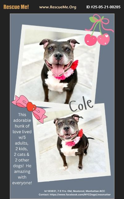 COLE is only at the shelter because of his family's housing insecurities. He lived with 5 adults, 2 children, 2 cats and 3 other dogs (Babs who is still in need, and the other dog since euthanized) and left with no information! Cole was playful and respectful of everyone. Cole is a lively, affectionate boy who is always ready to bring excitement and companionship into his future home. He greets people with soft eyes and a wagging tail, eager to interact and engage. His playful spirit shines through, whether he's happily trotting on a walk or lounging indoors. He enjoys meeting familiar faces, and his social nature makes him a wonderful companion for a family looking for a dog that thrives on human interaction. Cole loves enrichment activities, happily engaging with toys and showing off his wiggles when spoken to. Beyond his playful energy, Cole also has a love for adventure. He enjoys bath time, he loves wading in the water and isn't shy about hopping into a kiddie pool for some fun. His enthusiasm for exploration makes him a great fit for a home that appreciates both active outings and cozy indoor time. He responds well to petting and treats from familiar handlers, gently accepting affection. On walks, Cole loves to sniff and explore, showing curiosity about his surroundings. His eagerness to move and engage with his environment keeps outings lively and entertaining. Cole has a strong bond with people, always eager to be involved in whatever is happening around him. He enjoys spending time in common areas with his family, making sure he's always a part of the action. Whether he's playfully bouncing around, responding to his cues like 'sit' and 'stay,' or simply lounging alongside his loved ones, his affectionate and social personality shines through. He is ready to bring joy, companionship, and a little bit of adventure to a loving home that will appreciate his playful energy and warm heart. Cole's heart has been hurt 3 times. First in 2023 when he came to the shelter for the first time, then when his fellow housemate Rambo attacked him when he was just trying to eat his own meal, and now for a third time when his family faces eviction. Let's not hurt Cole again. He is set to die and it's high time he found the forever family that will commit to him and cherish him forever. What my friends at ACC say about me: My history is a mystery and my friends here do not know much about me yet! I would appreciate slow introductions to new people and places to help me feel safe. I'm ready to learn! I need a patient person who has the time to work on training with me. I love to be loved, but on my own terms! Let's brush up on some canine body language together! I would do best in a home with only adult humans. COLE, ID# 183831, @ 7.5 Yrs. Old, 89 lbs., Neutered Male Manhattan ACC, Large Mixed Breed, Black Brown/White Owner Surrender Reason: 4/15/25 - Stray Behavior Assessment Rating: LEVEL 3 Recommendations: No Children under Age 13 Medical Behavior Rating: 1. GREEN