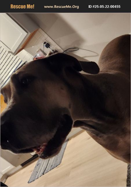 4 year old Great Dane female. Purebred. Neutered. A bit shy when you get to meet her but warms up when shown affection. Looking for a good home Surrender due to change in lease agreement.