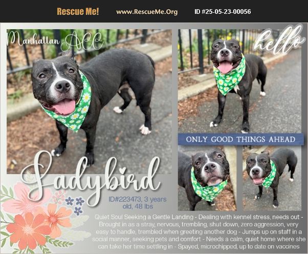 ��%90%BE Meet Ladybird - Quiet Soul Seeking a Gentle Landing - Ladybird came to us in the middle of the night, after her owner was unexpectedly arrested and there was no one left to care for her. Officers brought her to ACC, and she arrived trembling, unsure, and completely alone. At just 3 years old, this medium-sized sweetheart is trying her best to navigate an overwhelming world-and she's looking for a patient, loving adopter who can help her rediscover safety and trust. ���� Adoption Fee: $75 Ladybird is ready to trade in her uncertainty for comfort. If you're someone who believes in second chances and quiet triumphs, come meet this tender-hearted girl. She may be timid now, but with your help, she could learn to fly. ��%90z LADYBIRD@MANHATTAN ACC Ladybird ID#223473, 3 years old, 48 lbs Medium Mixed Breed, Black Spayed Female Came into shelter as a Agency �'��Medical Behavior Evaluation: 2. Blue Behavior Evaluation Rating: LEVEL 3 INTAKE DATE: 3/30/2025 PET PROFILE: My health has been checked. My vaccinations are up to date. My worming is up to date. I have been microchipped