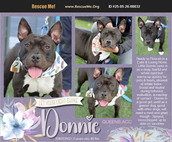 A Gentle Soul Ready to Bloom �Ϭ��%90%BE Sweet Donnie is only three years old, but her story is already full of heartbreak. She came into the shelter as a stray-scared, wide-eyed, and unsure-but it didn't take long for her soft, sweet nature to shine through. With just a little kindness, Donnie leaned in for pets and gently took treats from caring hands. Now this compact, loving girl is waiting for a chance to show just how special she is. Donnie's calm and friendly spirit has made her a favorite at the shelter, even being trusted as a greeter dog because of her sweet demeanor. She's good with other dogs (just needs a meet and greet) and is already spayed, microchipped, and up-to-date on vaccines. She's ready to start her new life-all she needs is a home to call her own. But time is running out. Donnie is on the euthanasia list, through no fault of her own. She deserves to know love, security, and the simple joys of a safe home. Please-open your heart to this gentle soul and give her the chance to flourish. ������%90%BE Donnie needs a foster or adopter now. Please don't let her story end here. Share, step up, and let's give her the life she's been waiting for. ���%8DNYC ACC #SaveDonnie #CompactSweetheart #RescueDonnie #EndTheList #FosterOrAdopt #RescueIsLove #ShelterDogsNeedYou #AdoptDontShop DONNIE@QUEENS ACC Donnie ID#223102, 3 years old, 45 lbs Medium Mixed Breed, Black Spayed Female Came into shelter as a Aco/Impound �'��Medical Behavior Evaluation: 2. Blue Behavior Evaluation Rating: LEVEL 3 INTAKE DATE: 3/25/2025