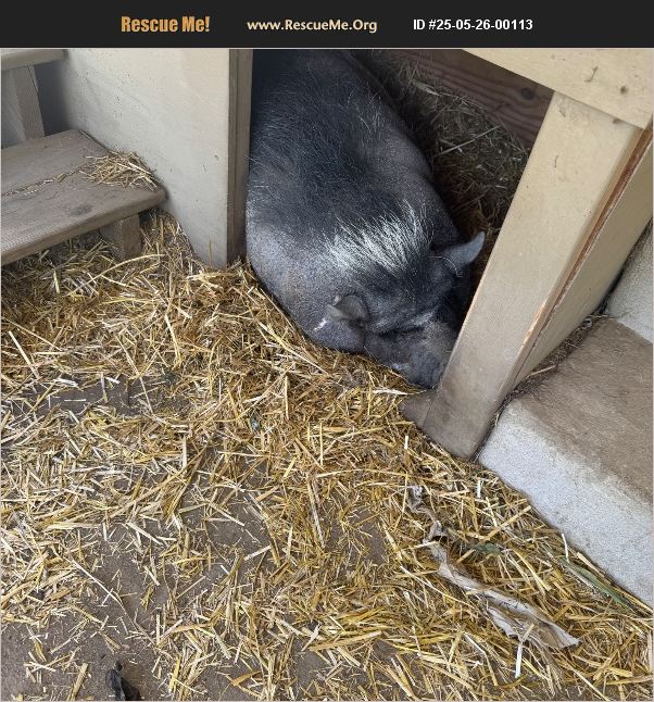 Aging 'mini' pig. (She weighs at least 150) She's quiet, mostly just eats grass and naps. Loves belly rubs and to be brushed by a broom. Needs a mud hole to maintain skin health.