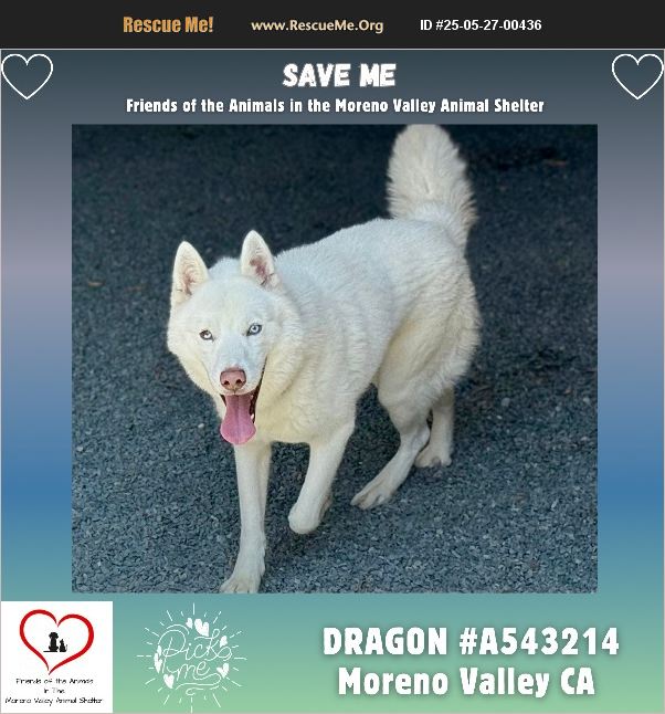 ID#A543214 Shelter staff named me DRAGON and I am a male, white Siberian Husky mix. The shelter thinks I am about 5 years old. I weigh approximately 42.20 lbs. I have been at the shelter since May 20, 2025 and I may be available for adoption on May 28, 2025 at 10:00AM.