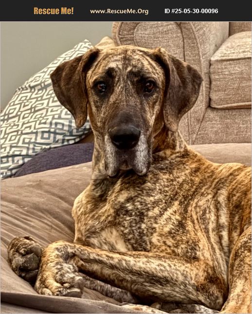 Great Dane Male, neutered, stomach tacked - 4.5 years old. Has been raised in a home with 2 other older dogs (both doodles) and 2 cats. Due to a change in our housing situation, Bruno needs a new home. He is a pretty timid dog (afraid of every sound or new object He hasn't been leash trained, but does respond pretty well to a training collar (never used shock, just beep and vibrate He needs a home with someone that is around on a regular basis as he is a bit clingy.