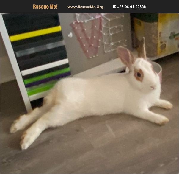 5month old bunny he's white with brown spots around his eyes and 3 spots on his back. have to rehome him because the place we are moving to doesn't allow animals.