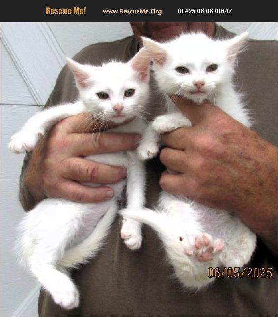 Uriel & Michael-DLH White male kittens (BONDED), ~ 10 wk. (June 2025) Contact [email protected] for an application. Uriel & Michael came into the Rescue when they were abandon as tiny babies with their mother, to a small town Vet office. They asked the Rescue to help the babies find their new home together, they are so sweet and bonded to each other. They are only looking for a home that will keep them together. The boys have been living in a foster home with other cats and small dogs. The boy's adoption fee is $150 EACH, to help cover the medical costs of getting ready for adoption. For our application, please email [email protected]. Please include your location and a phone number for future communication.