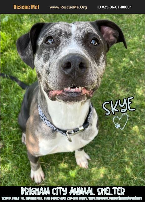 Skye! 3 years old Spayed Female 53 lbs Adoption Fee: $190 Skye is a stunning black merle beauty with a heart as sweet as her speckled coat! This gentle girl came to us as an owner surrender due to housing issues, no fault of her own. She's already a pro at home life: house trained, crate trained, and great on a leash. Skye previously lived with a Chihuahua and did well, but she's a bit picky with bigger dogs and would likely thrive as the only pup or with a very calm, respectful companion. Cats? She 'might' be okay with a dog-savvy feline friend. She's also done well with kids over 3 and has a sweet, affectionate nature that wins hearts quickly. Skye's waiting for a loving home where she can feel safe, adored, and part of the family again. Could that be with you? Come meet this lovely girl and let her steal your heart! All adoptions are upon approval of the adoption application only Shelter Hours: Tues-Fri 12-6pm Brigham City Animal Shelter 1220 W Forest St, Brigham City, UT 84302 (435) 723-1231 https://www.facebook.com/brighamcityanimals To see a reel about Skye created by a volunteer, please check out: https://www.instagram.com/reel/DKkbDZRMGoQ/?igsh=OTFqdnZrbW1yZHZk
