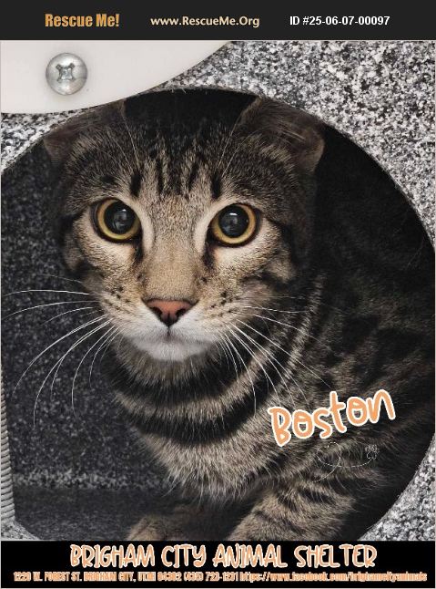 Boston's Details: Breed: Domestic Shorthair (Tabby) Gender: Male Age: 7 months Compatibility: Good with other cats Boston is a sweet young cat looking for a loving home. He is playful, friendly, and enjoys the company of other cats. If you're looking to add a wonderful companion to your family, come meet Boston! All adoptions are upon approval of the adoption application only Shelter Hours: Tues-Fri 12-6pm Brigham City Animal Shelter 1220 W Forest St, Brigham City, UT 84302 (435) 723-1231 https://www.facebook.com/brighamcityanimals Volunteer shelter page: https://www.instagram.com/tiffandhershelterfriends/