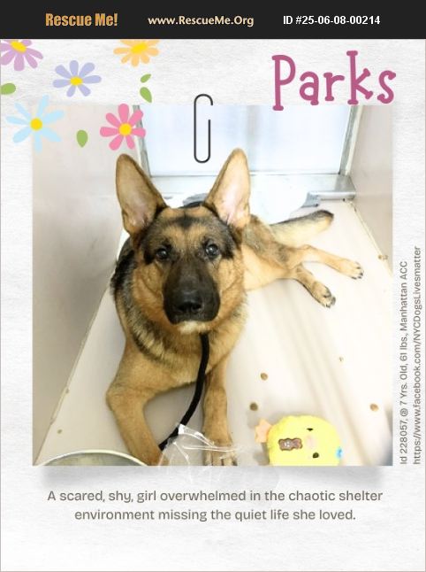 Another day at the shelter, another frightened and overwhelmed dog with a broken heart not knowing who she can trust. This is PARKS, a senior lady who lost her home and everyone she loved and who has never been exposed to such a chaotic, loud environment where she knows no one and has no idea what will happen to her next. Please share Parks. She will need an experienced foster or adopter who can provide her a quiet, calm, low traffic home where she can fully decompress and warm to a new life filled with love. PARKS, ID# 228057, @ 7 Yrs. Old, 61 lbs., Female Manhattan ACC, Large Mixed Breed, Brown/Black Surrender Reason: 5/28/25 - Behavior Assessment Rating: New Hope Only Recommendations: No Children under Age 13 Place with a New Hope Partner Medical Behavior Rating: