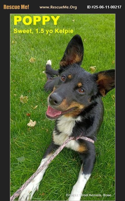 ***NEEDS FOSTER or FOREVER HOME*** Currently in Boise boarding kennels Meet POPPY ! She is an adorable 1 to 1.5 year old Australian Kelpie mix and only ~25 lbs. She is sweet and loving to humans/strangers. She has a gentle mouth so could be good with kids. She needs refresher and practice on 'sit' and 'down', but seems smart and willing to please especially for a treat. We learned a lot about POPPY recently when she scored a home for her to recover in post-spay surgery. She has been a perfect angel with the resident big dog...no need to keep them separate ever! She is house-trained, crate-trained, quiet, and sleeps through the night ! She minds her people and calms when her pack requires it. She is not a picky eater and enjoys her chews and treats (see video). She knows how to work on a stuffed Kong too. She walks well with the resident dog, but has a lot to say when we see dogs on our walk. She is fine when she gets up close to them, however. She is a good car-rider too. MORE PHOTOS/VIDEOS: https://photos.app.goo.gl/6x6TWhcvfj3C8s3c8 POPPY is spayed and current on vaccines so ready for her forever family. Complete an easy, online application to meet POPPY in Boise. APPLICATION: https://forms.gle/U3UUbdpNzZVpxP9h8