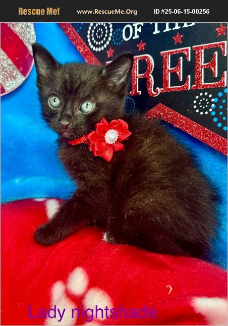 LadyNightShade is a sweet and mellow black kitten with a sweet and gentle personality. She is playful, curious and affectionate. She will be spayed, tested negative for FIV, FeLV, and Heartworm. She is microchipped.
