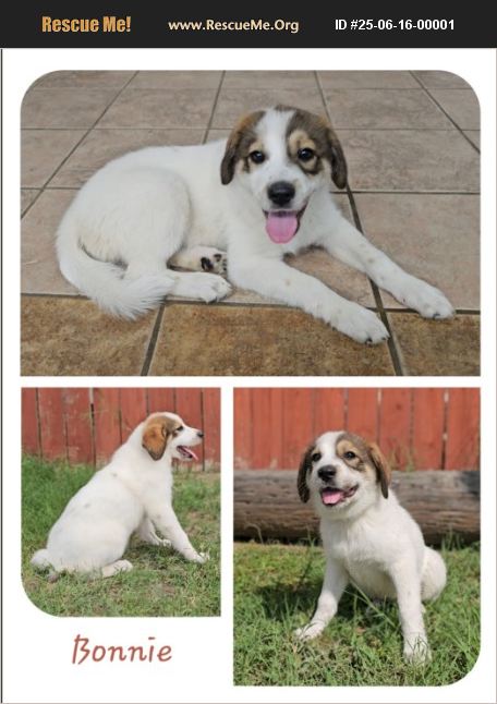 Bonnie is a dense fluffy coated pup that was an owner surrender. We were told that she was a Saint Bernard/Pyranees mix, but we are very doubtful. She is 16 lbs, three months old, and her feet are pretty small. Our best guess is some sort of Aussie mix, but we could be wrong. Bonnie is scheduled to be spayed shortly and we be able to go to her new family after that. She is UTD on all shots, microchipped, and already on preventatives. She is pad trained but not fully housebroke. She loves getting into her 'doggy' swimming pool and playing with the other foster dogs and cats. Its hard to see in the pics, but she has muted spots throughout her white coat. We require an application and a vet check for our adoptions. Please contact me with questions about Bonnie or to fill out an application.