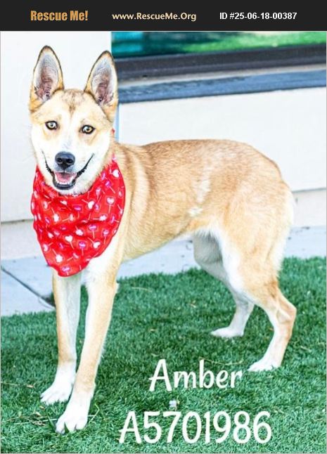 Amber is in a high kill shelter in Castaic, California. Please give this beautiful girl a loving home that she's so deserves!! Transportation information is available. Name: AMBER Animal Location: Castaic - X102 Animal ID: A5701986 Date in County Care: 6/14/2025 Availability Status: Ready to go home Primary Breed: ALASKAN HUSKY/ SHEPHERD Primary Color: FAWN Sex: Female Weight: 32 pounds Age: 1 year