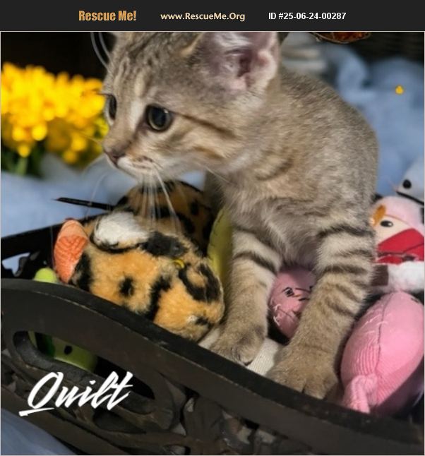Quilt has a beautiful golden Tabby coat. She likes to play with other kittens and was very affectionate with her foster. Quilt loves to play with cat toys and can get a little possessive of her favorite ones - usually a soft toy with feathers attached. Come meet sweet Quilt!