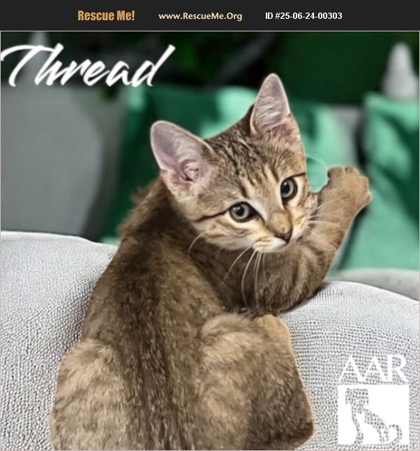 Thread is an energetic kitten! He goes at full speed chasing his favorite toy - a plastic spring looking thing that somehow always disappears. Thread's dream home would have an unlimited supply of those. When he gets tired wants to cuddle with his person or a kitty friend. Come meet this fun boy!