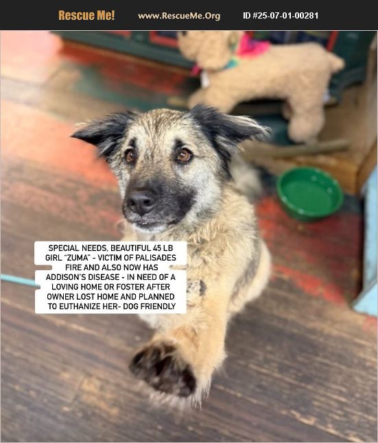 Courtesy Posting: CARPENTERIA/NR VENTURA, CA- SPECIAL NEEDS, BEAUTIFUL 45 LB GIRL 'ZUMA' - VICTIM OF PALISADES FIRE and also now has ADDISON'S DISEASE - IN NEED OF A LOVING HOME OR FOSTER AFTER OWNER LOST HOME and PLANNED TO EUTHANIZE HER- DOG FRIENDLY Please help us find a forever home, or foster, for Zuma who was adopted by a family who later lost their home in the Palisades fire. They were planning to euthanize because they no longer could care for her when a kind person hearing about her dire situation just stepped in and has placed Zuma in temporary boarding in hopes a home or foster can be found quickly so she is not euthanized. Zuma is currently at a doggie camp where she regularly interacts with other dogs and has made friends. She is described as a great dog who loves to play with toys and aims to please. We have nice videos of her enjoying being pet and with other dogs. Zuma has a very soft coat, a blackish tongue suggesting she has some chow in her, although she looks more shepherd and border collie like. However, at only 45 lbs, she is perfect size and can also make a great companion. Zuma is already spayed, vaccinated and chipped. While she has been diagnosed with Addisons, which requires hormone replacement therapy and is on prednisone for this, we understand it should not affect her life span, unless it's untreated. Zuma currently takes a pill every other day. We are now looking for a loving home or foster to save Zuma. If you are interested in meeting and adopting Zuma, please contact [email protected] or Southern California Chow Chow Rescue Network who is assisting the good sam with placement. If you have another dog or pet, a meet and greet is strongly advised, and she is recommended to be fed separately as she had some food resource guarding in a temporary home. We will be posting more pictures and videos of Zuma on facebook at: https://m.facebook.com/story.php?story_fbid=10167326575383125&id=783968124&mibextid=wwXIfr Note: to view contents of link you will need to copy and paste it into your browser.