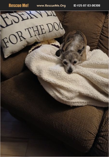 Couch companion - yes. Walking buddy - yes. 7 year old, 8#, brindle colored Chihuahua in need of a home. Needs to be the only dog. Healthy, up to date on heartworm and flea meds. Housetrained. She will come with her food, toys and beds.