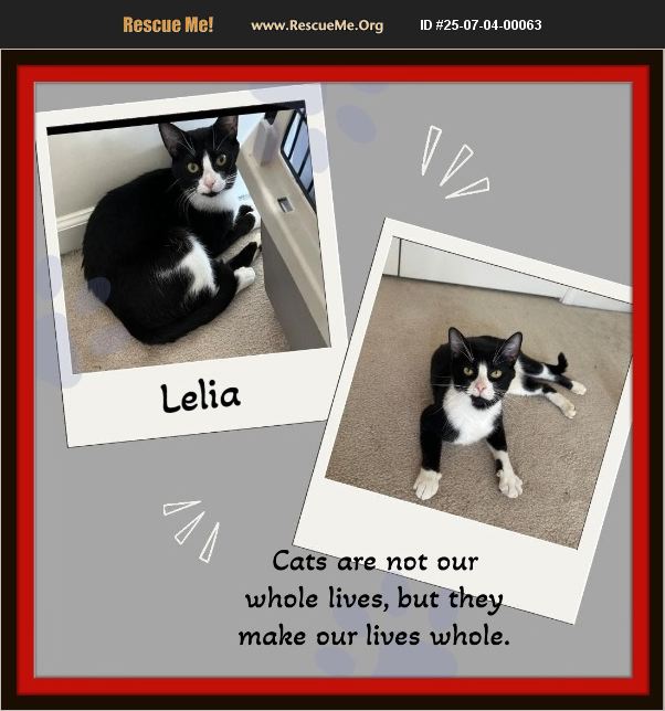 Hello, my name is Lelia! I am a people pleaser kitty! I do enjoy just time in your lap being adored by people. I will probably fall asleep in your arms. I hope you don't mind. I have the most unique black and white color pattern which adds to my beauty and charm. I am an engaging kitty with my people which means when you pet me, I will purr and purr. I will lean into chin scratches to show you it feels sooo good. I appreciate all the attention you want to share with me. My perfect day would be sharing the time with you. Me in your lap, or next to you, and you talking to me about our day. My story is that I was found as stray kitty by a nice teenage who contacted the rescue. The rescue thinks I was someone's kitty and was put outside and abandoned because of my incredibly sweet nature. I was pregnant and had four kittens. Three are still available and posted. If you are able to adopt two kitties, my little 14 week old girls are posted, Koko, Silvia, and Wednesday. Pictures are in my profile. I would be just fine as a single kitty, or with another kitty if you already have a kitty. No worries either way. My best home would be with kids over 10 years old, other kitties. I don't mind doggies either. I enjoy playing with spring toys, chasing glitter balls or cat nip toys. My eyes become huge with excitement with the dangle type toys. I have been spayed, vaccines are done, and micro-chipped, an added benefit of adopting from Snow Camp, which includes life time free chip registration. A cost huge savings! Apply to adopt online, by going to our website, Snow Camp Sanctuary, contact page, and scroll down. Then click the link that states submit online HERE, on the Snow Camp site, https://snowcampfurever.com/adoption-application or on this site, contact us. The rescue offers a two-week trial adoption to make sure we are a good fit for your home. If not, they will gladly take me back if you are not falling in love with me. An adoption guarantee! My adoption fee is normally $175. The rescue is running a July 4th, Freedom Special, take $25 off If you adopt me by July 15, 25. If you adopt a second kitty from the rescue, or my of my girls with me, the rescue will give you another $25 discount off on the second adoption fee. A nice cost savings. And that's not all..... Come see me at the Hanes mall Pet Supplies Plus in Winston-Salem. The store is offering an adoption bonus of 15% off discount off everything in the store as an adoption gift to get supplies and food to bring me home with you (some items have larger discounts), too! What a deal!! Your lap is where I want to be! Rubbies, please....signed Lelia