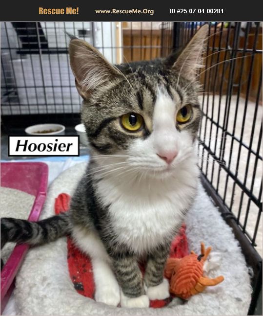 HOOSIER IS AN OUTGOING AND FRIENDLY OLDER KITTEN. HE LOVES PEOPLE AND GETS ALONG WITH DOGS! APPLY AT PROJECTHOPEARF.ORG