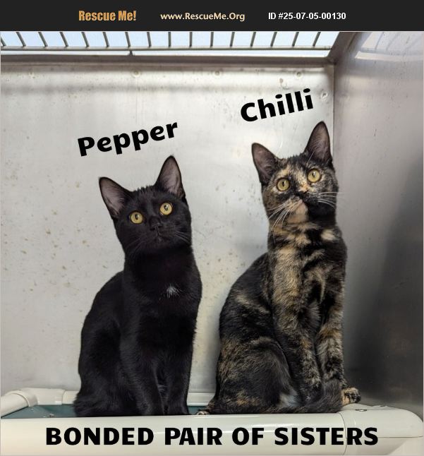 BONDED PAIR OF SISTERS. Chilli and Pepper need a quiet understanding home that will let them adjust slowly to their surroundings. They came to us as feral kittens, and they are very skiddish. MUST stay together always. Needs to be kept safely indoors, and will do best with a 'safe space' of their own.