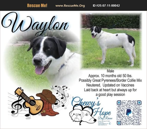 Meet Waylon ��%90%BE Approx. 10 months old | Great Pyrenees/Border Collie Mix (possibly) | Male Waylon's story started on a quiet backroad, where he and his brother Willie were found abandoned-but despite his rough beginning, this sweet pup hasn't let it dim his spirit. Laid back at heart but always up for a good play session, Waylon strikes a perfect balance between calm companion and playful pup. He's incredibly friendly, thrives on human attention, and will gladly soak up all the love and pets you're willing to give. Waylon is also an excellent little watchdog. He's naturally alert and observant, always keeping an eye on his surroundings, which makes him a great 'alarm dog' (without being overly vocal or reactive). We believe he may be a mix of Great Pyrenees and Border Collie-bringing together the loyal, protective nature of a guardian breed with the smarts and charm of a working dog. Waylon is looking for a forever home where he can be safe, loved, and part of the family. Could that be with you?