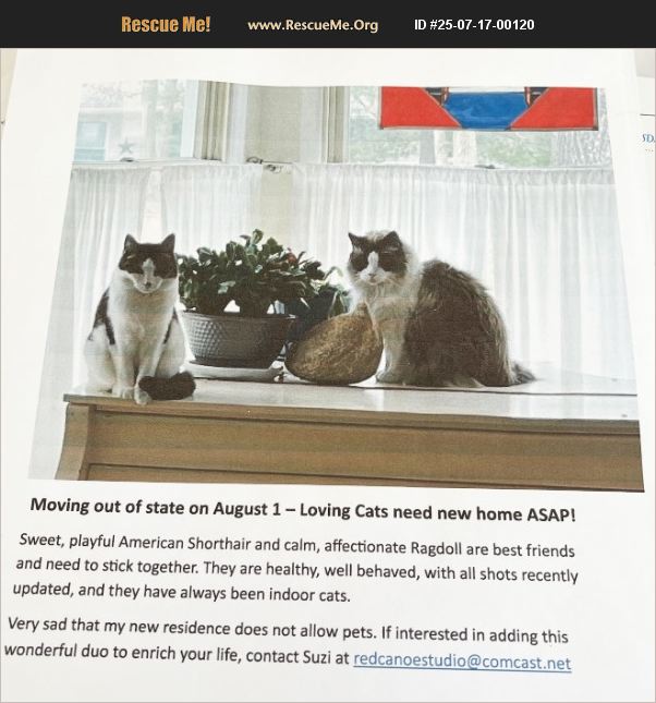 Bonded pair of Ragdoll and American Shorthair. Moving very soon and searching for a good home. Adoption includes receiving a new state-of-the-art self-cleaning litterbox.