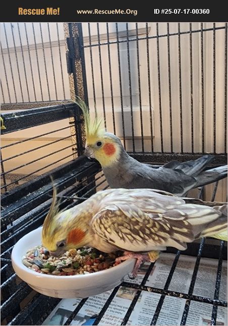 One male cockatiel and one female cockatiel up for adoption. The gray one is male and the white one is female. They are not finger stepping trained. They are a couple and need to be adopted together. They come with a big cage (size 48x55) and can hopefully be raised in that cage or any big cage. Frequent interaction and time outside of the cage would be preferred.