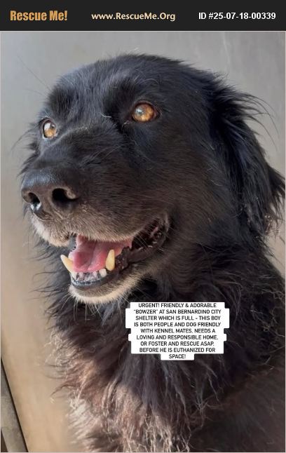 Courtesy posting: URGENT! FRIENDLY AND ADORABLE 'BOWZER' AT SAN BERNARDINO CITY SHELTER WHICH IS FULL - THIS BOY IS BOTH PEOPLE AND DOG FRIENDLY WITH KENNEL MATES, NEEDS A LOVING AND RESPONSIBLE HOME, OR FOSTER AND RESCUE ASAP, BEFORE HE IS EUTHANIZED FOR SPACE! BOWZER - ID #A581860 San Bernardino City Shelter, in So Cal Help! The SBC shelter is full, and we would love to find dear Bowzer a wonderful home (or foster) before his time runs out. Bowzer was found as a stray and is believed to be only 7 years young with no know medical issues. He has been overlooked because he was originally listed as a lab and chow mix for some unknown reason. His tongue is pink. The shelter finally just updated his breed to flat coated retriever, which he resembles, and dropped the chow breed, although we do not know his exact breed but he definitely looks like some sort of retriever. What we do know is that the shelter told us, he 'has no medical or behavioral concerns. He has been kenneled with other dogs with no concerns so far.' He can be also be seen in video very calm. If you are interested to adopt Bowzer and give him a forever home, please contact the shelter directly using his link: https://24Petconnect.com/DetailsMain/SBCT/A581860 or by calling San Bernardino City Animal Control at (909) 384-1304 and ask his ID. If you can foster for a rescue, please ALSO contact [email protected] or Southern California Chow Chow Rescue Network who is trying to assist the shelter with his placement, given rescue groups also need a foster to usually save a dog. We will also post additional pictures, video and updates on facebook at: https://www.facebook.com/783968124/posts/10167487944363125/?mibextid=wwXIfr Note: to view contents of links you will need to copy and paste each link separately into your browser.
