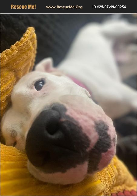 **Eva is a pure breed Dogo Argentino. There is no dropdown box for this on Rescue Me ** Eva is an absolute ham, a play-to-the-camera superstar whose endearing personality is irresistible and adorable all at the same time. She is an aspiring couch potato who has a masters degree in snuggling. This is her absolute favorite thing to do. She loves people of all ages and is very tolerant of even the most unruly, rambunctious child, and she is happy to chill with the family and be part of whatever it is you are doing. Eva likes car rides, appreciates treats and is completely willing to be bribed with her favorite snacks when it's vet visit time. This girl is a gem!