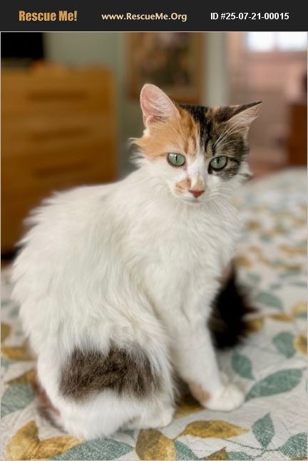Scarlett has piercing green eyes that just draw you right in! She is a stunning Calico lady who recently had 3 kittens in a loving foster home.She was a most attentive, loving Mom to her babies but now they are old enough to care for themselves so she is free to move forward for her own happy new life. Scarlett has the typical Calico temperament - she's sweet and loves to play but you might see her spunky side too! She has a gorgeous long coat that she grooms fastidiously. Scarlett is a tiny lady, only weighing about 7 lbs. She loves to hang out and observe the comings and goings outside the bedroom window. Very calm but ready to play whenever you are. Just the perfect combination of chill and younger cat energy. Definitely a head turner!She's spayed, microchipped, vaccinated, combo tested NEGATIVE and ready to bring years of companionship to your home.Her estimated age is 1-2 yrs.