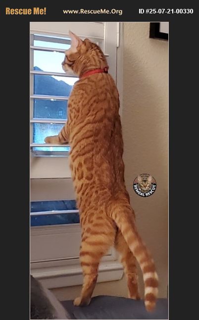 Announcing our VERY first Red Bengal!!! (Yes - it's a THING!) Meet Beni - a stunning and rare Red Bengal who is 2 years and 10 month's old, and sadly must be the 'one and only.' Beni's story is a tough one. He was abandoned by his original owners when he was only a year old. When the neighbors realized he'd been abandoned, they were absolutely heartbroken over it. They took over feeding him on their porch and not long after, Beni claimed them as his family. Beni's family couldn't HELP but to fall in love with his loving and winsome nature. What they didn't count on though - is that Beni didn't want to share. They had two other cats in the home and it wasn't long before Beni became extremely aggressive with both of them. After a year of trying to blend their feline family, Beni's family realizes that he would truly be happy with a fur-free kingdom of his own. They dearly wish that Beni could tolerate his 'roommates' however they realize that it's just not in the cards. They truly want Beni to have a long and happy life ahead. Beni is a typical Bengal. He is active, curious, loves to chase balls, strings, bugs. He's a tree-dweller in that he always seeks out the highest place to survey his home. He loves to bird-watch - both inside (the family has a bird) and outside (through the windows). Beni often loves to climb on the 5' tall bird cage (we wonder what the bird thinks about that?). Beni is a 'people person.' He is so affectionate with his humans! He is rare, in that he actually loves cuddles and kisses! His fur is so soft - like a bunny. He has a glorious coat that he keeps in tip-top shape. His family absolutely loves he huge soulful eyes, saying how much his expressions remind him of Puss n' Boots from Shrek (we see it too!). Beni's family says he is a purr-machine. His motor goes from zero to sixty in seconds! He loves belly rubs and will patiently wait for his humans to stop what they are doing to indulge him in a love session. Beni has perfect litter box skills. He's never once had an 'accident' in the home. He is neutered, vaccinated, and has been properly vetted. Like most bengals, he does have a sensitive tummy, so his diet will need to be consistent (initially it was addressed with an RX diet but now he's on a standard diet). Beni has SO MUCH LOVE to give, and would do best in a home with no other cats, and no children under the age of 12. If you are interested in adopting Beni, please fill out our Adoption Application: https://new.shelterluv.com/matchme/adopt/BRUT/Cat