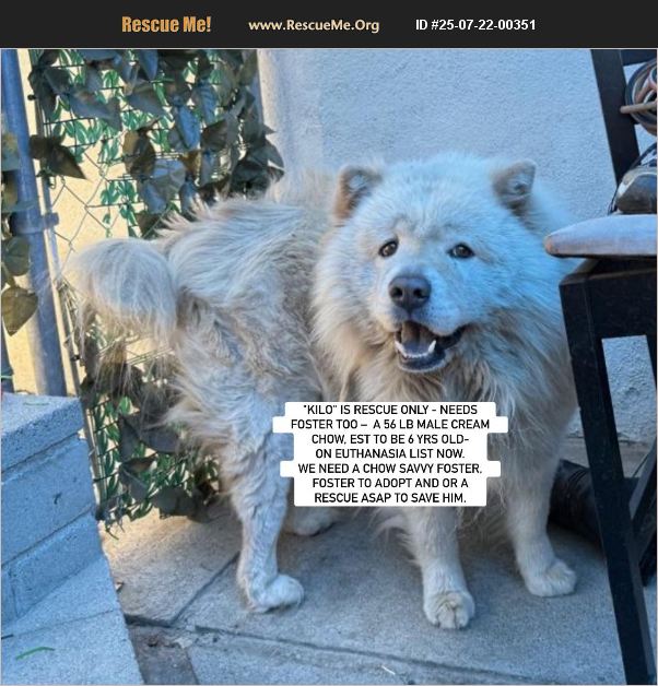 Courtesy Posting: X URGENT AT BALDWIN PARK, CA (SO CAL) ID #A5710614 at LOS ANGELES COUNTY ANIMAL SERVICES- 'KILO' is RESCUE ONLY - NEEDS FOSTER TOO - A 56 LB MALE CREAM CHOW, EST TO BE 6 YRS OLD- ON EUTHANASIA LIST NOW. He is RESCUE ONLY for A BITE TO KNEE AFTER SOMEONE ALLEGES THEY TRIED TO MOVE HIM (WITH THEIR KNEE?), CIRCUMSTANCES WERE NOT CLARIFIED AND OWNER DID NOT LEAVE NOTES. BUT YOU CAN SEE HIS UTTER NEGLECT AND TELL WHAT SORT OF HOME HE CAME FROM. WE NEED A CHOW SAVVY FOSTER, FOSTER TO ADOPT AND OR A RESCUE ASAP TO SAVE HIM. Emergency- Kilo is soon to be euthanized. Please watch his video, he shows no aggression and acts like a typical aloof chow in the shelter. After being locked up for over two weeks, he was just let out for the first time in the yard as seen in video we were just given. The shelter behaviorist let us know, 'No pro-social behaviors noted during our interaction. Some growling, side eyeing with any touch around his neck/face. He didn't seek any engagement or show interest in toys. ' Basically, he is being a chow in a scary shelter environment. We are now in urgent need of finding a chow savvy foster and rescue for this handsome male chow before he is killed. This is his listing link to check his status: https://animalcare.lacounty.gov/dacc-details/... Please note he may not be adopted directly from the shelter, he requires a partnered rescue to pull him and sign an indemnity waiver. Rescues need fosters. Therefore, if you may be interested in fostering, fostering to adopt, or helping in some other way (ie., pledging for his rescue), please contact [email protected] or Southern California Chow Chow Rescue Network who is trying to find placement asap, and we can try to pair fosters or interested parties with a willing rescue group. Rescue groups may contact the shelter directly at: [email protected] and by calling: (626) 962-3577 and providing his ID. We will be posting additional photos and videos on his Facebook page at: https://www.facebook.com/783968124/posts/10167506447083125/?mibextid=wwXIfr Note: to view contents of links you will need to copy and paste each one separately into your browser.