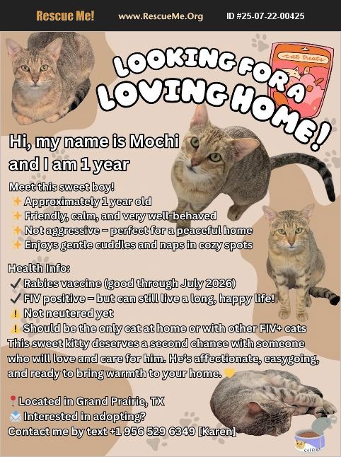 Found outside and came inside. Very friendly! He is up to date on rabies vaccination. He is FIV positive. I would keep him but I have a cat that isn't FIV positive so I am unable to.