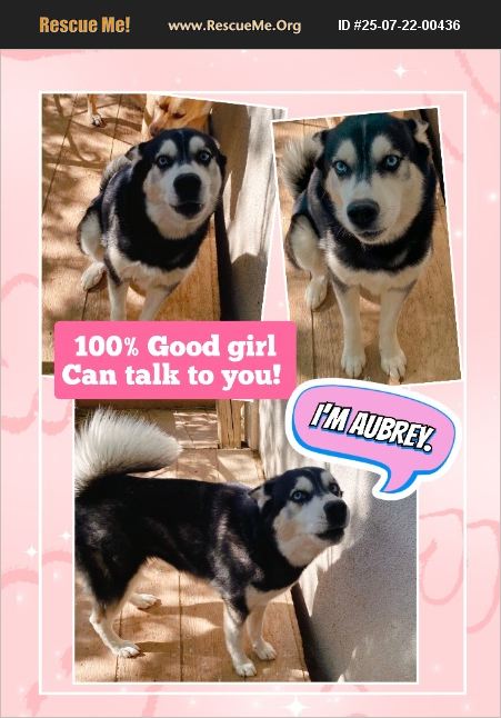 Aubrey is a stunning 2-year-old Husky with striking blue eyes, a heart full of love, and an unbreakable spirit. Despite a tragic past where she was cruelly abused and abandoned in a crate on the side of a dirt road, Aubrey is now safe and thriving in rescue. She is leash trained, very intelligent, affectionate, happy, and loves to talk. Aubrey is friendly with all dogs and does well with older kids who are gentle. She is not suited for a home with cats. Aubrey is healthy, spayed, microchipped, and current on vaccinations. She is currently with Just Paws Inc. in Odessa, Texas. Transportation must be arranged at the adopter's expense. If you are ready to give Aubrey the loving home she deserves, please contact Just Paws Inc. at 432-788-4002 by call or text.