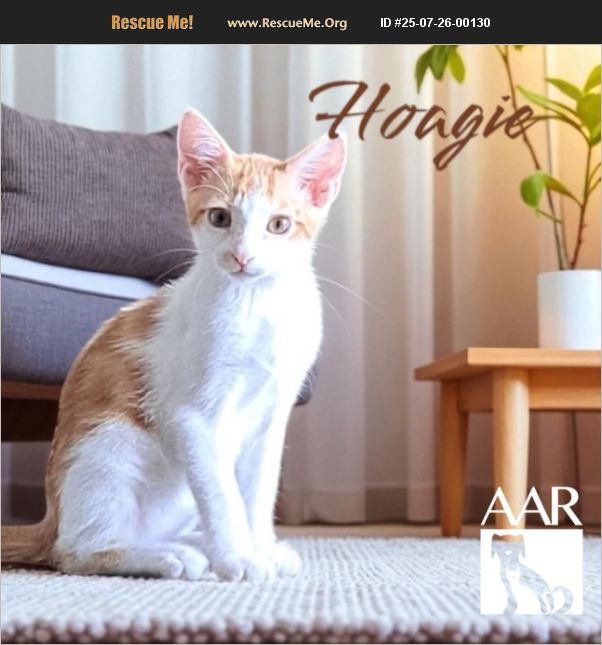 Meet Hoagie! This great kitten loves to play and run, but he can be startled by loud noises or sudden movements and might prefer a quieter home. He likes to sit in a lap when he's relaxed. He and his siblings were born on a back porch and were taken care of until they were old enough to leave mom. Hoagie has not been around children or dogs.