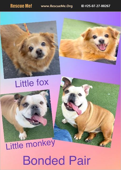 BONDED PAIR SEEKING THEIR FOREVER HOME!!! Meet Little Fox & Little Monkey - an unlikely duo who deserve a happy ending after all they've been through! Video: https://www.facebook.com/story.php?story_fbid=598907866620639&id=745966825&mibextid=wwXIfr Video: https://www.facebook.com/story.php?story_fbid=1294987625578517&id=745966825&mibextid=wwXIfr Video: https://www.facebook.com/story.php?story_fbid=1285692853203926&id=745966825&mibextid=wwXIfr Video: https://www.facebook.com/story.php?story_fbid=1126664029342824&id=745966825&mibextid=wwXIfr Little Fox (#A1837669): 10-year-old, 16 lb. Pomeranian (spayed female) -Mellow, loves relaxing walks & naps in the sun. -Generally very sweet & affectionate; enjoys calm pets & belly rubs. -Can occasionally be a cranky granny when she's had enough pets - so a kid-free home is best. Little Monkey (#A2064745): 4-year-old, 50 lb. English Bulldog (female) -Very loving, cuddly & outgoing -Has spurts of energy; also a big fan of sleep -Will absolutely cut in line for pets and treats (no shame!) Their Story: They belonged to someone who truly loved them but lived in an RV and faced serious ongoing health issues. For the past several years, these pups have been in and out of our shelter multiple times as their owner was repeatedly hospitalized. Their most recent intake date was Nov. 2024, and just recently, their owner made the heartbreaking decision to surrender them permanently, knowing he could no longer provide the stable life they deserved. While staff & volunteers have given them great care over the years, the reality is that shelter life is stressful & unpredictable. It's been too long since this pair have known true stability, so they really deserve a home where they feel safe and secure! West Los Angeles Shelter 11361 W. Pico Blvd Los Angeles, CA 90064 Tues-Fri 8am-5 pm; Sat-Sun 11am-5pm; closed on Mondays & holidays