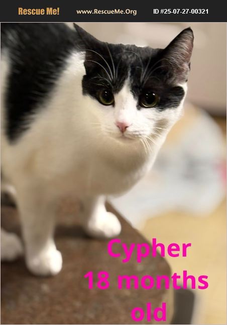 Cypher is a 18 month old female tuxedo Manx! She is sweet and curious and adores attention and will talk to you to! Cypher has never been a solo cat and needs to go to a home that already has another cat or be adopted with another. She has been spayed, fully vaccinated, is FIV/FeLV negative, dewormed, and has been microchipped. Her adoption fee is $125.