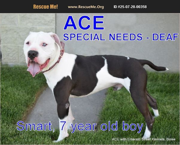 ***NEEDS FOSTER or FOREVER HOME*** Currently in Boise boarding kennels ---SPECIAL NEEDS - DEAF--- Meet ACE ! He is a handsome just turned 7-year-old pit bull terrier with a beautiful, shiny coat and interesting eyes who found himself homeless through no fault of his own (owner lost his home). ACE is now looking for a kid-free home with a leader. ACE seems obsessed with kids and cries to be near them, but we are looking for a home without small children ()10 years) at this time. ACE is housebroken. He understands some hand signals like 'sit' and will sit for a treat. He is food-motivated to learn all good behaviors. ACE enjoys jumping into vehicles to go for a car ride. ACE is easily excitable. He loves to play, play, play. He has been fine on pack walks. He is currently playing in the off-leash play groups at his boarding kennel. We recently learned that he knows how to share...a neighboring kennel dog decided to go up and over his kennel and hung out in ACE's kennel all night! Everything was fine. ACE's adoption will include health vaccines, rabies vaccine, neuter surgery, and microchip. He is ready for his forever home! MORE PHOTOS/VIDEOS: Complete an easy, online adoption application to meet ACE in Boise APPLICATION: https://forms.gle/U3UUbdpNzZVpxP9h8