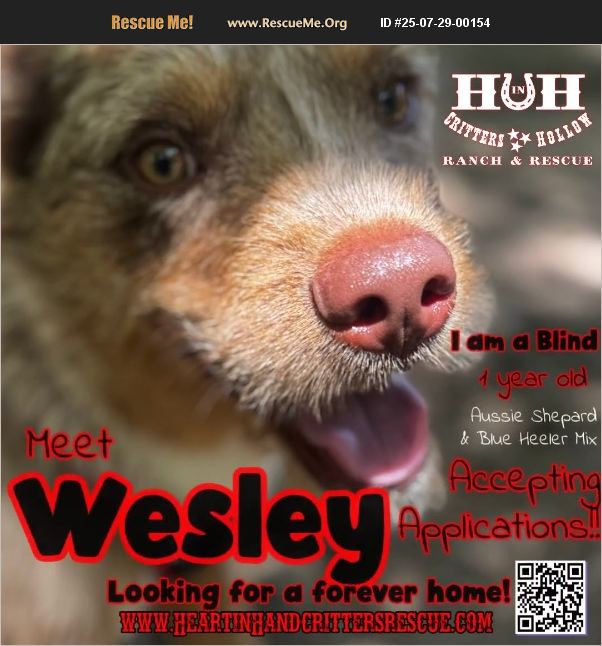Meet Wesley! Wesley is a Blind, 1 year old, Aussie Shepard/Blue Heeler Mix and desperately needs a new home asap! Gets along great with other dogs, cats and people. Will need someone who is patient with his special needs and understanding of his condition. He is susceptible to seizures, current care takers has pinpointed this down to a dietary issue. No corn or grain. So special diet will be needed. Has not had a recent seizure with a change in food. Wesley is up to date on vaccinations but still needs to be neutered. He will be ready to go home Mid-August but we are accepting applications! https://www.heartinhandcrittersrescue.com